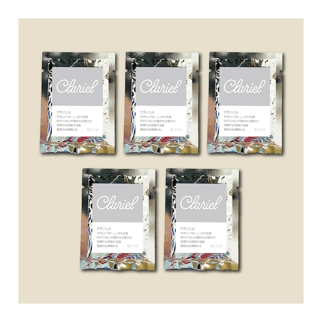 Clariel 300mlボトル用レフィル5包セットです。 1包で300ml容器一回分です。 【日本の最新技術を使用した除菌・消臭剤】 Clarielは、先進の光触媒分解消臭技術を採用し、臭いの元となる成分をしっかりと分解する効果があります。従来の消臭スプレーのように香りでごまかすのではなく、臭いの根本から解決してくれる商品です。 成分は食品添加物なので、キッチンからトイレまで幅広くご使用いただけます。 【幅広い用途】 キッチンの生ごみ、リビングのソファなどのファブリック、ベッド、カーペット、ポータブルトイレ、車いす、自動車のシートなどの消臭に、幅広くご使用いただけます。 【本体サイズ】(幅×奥行×高さ):5.5×5.5×20cm 【内容】本体容器300mlに粉末5gが内包されています(水は入っていません) 【使用方法】水道水に溶かしてスプレーとしてご使用ください Clarielは、OHラジカル*式の消臭・除菌ミストです。 OHラジカルの性質を利用して有害化学物質を除去することができるため、 大手電機メーカーの空気清浄機などにも採用されています。 対象に吹きかけることで、OHラジカルが次々と発生し、菌やウイルスを除去。 また、悪臭の元である有機物を分解することができます。 さらに、光(灯)触媒*の最新技術(2016年3月現在)を加えることで、消臭・除菌力を強化。 対象に吹きかけた後、太陽光や室内灯に当てておくと、より消臭力を実感できます。 * OHラジカルとは・・・空気中の菌、アレル物質(ダニの死骸やフン、花粉等ハウスダスト含まれる水素を分解し、水に変性させる性質を持ちます。 * 光(灯)触媒とは・・・太陽や蛍光灯などの光にあたると、その表面で強力な酸化力が生まれ、 接触してくる有機化合物や細菌などの有害物質を除去することができる環境浄化材料。 植物の光合成と同じ働きなので、地球にやさしく無害です。 <ご使用方法> ①ボトルのキャップを開けて、ボトルラベルの上位部(約9分目、300ml)まで水を注いでください。 ②キャップを閉め、粉末が水に溶けるようにしっかり振ってください。 ③ご使用前に、ブルーのノズルストッパーを外してロックを解除してください。 ④菌の付着やニオイの気になるあらゆる場所に、直接吹きかけてご使用ください。 ※使い始めのボトルは液だれする場合がございます。ボトルの口を緩めて空気圧を抜き、しっかり締め直してからスプレーしてください。