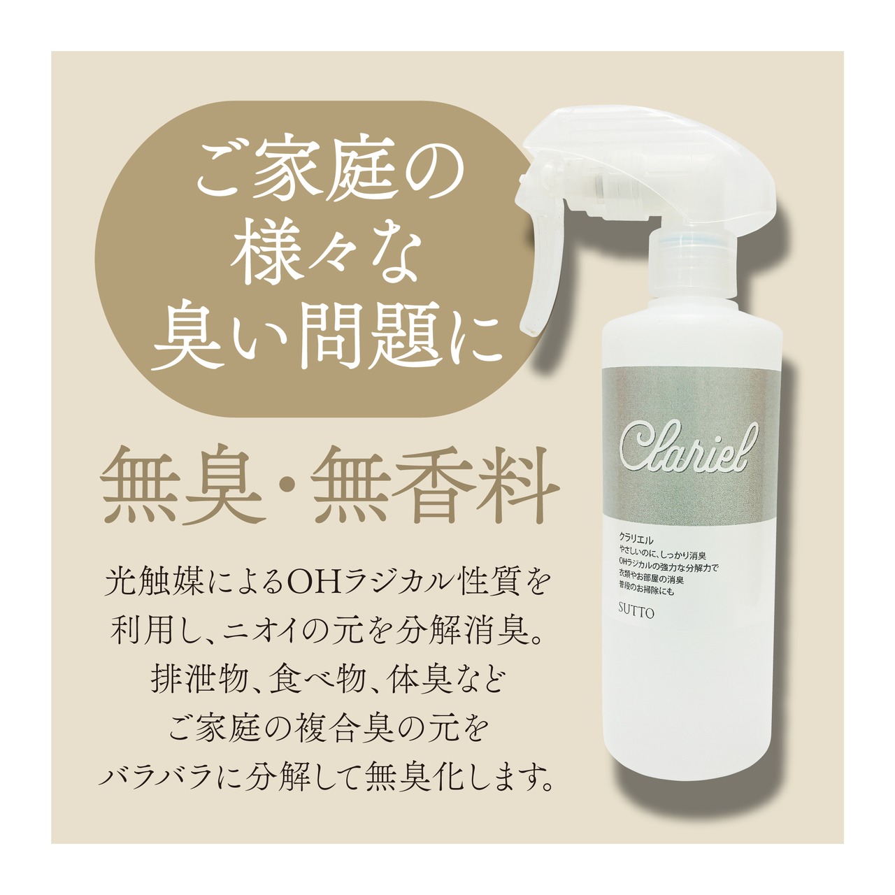 Clarielは、先進の光触媒分解消臭技術を採用し、臭いの元となる成分をしっかりと分解する効果があります。従来の消臭スプレーのように香りでごまかすのではなく、臭いの根本から解決してくれる商品です。