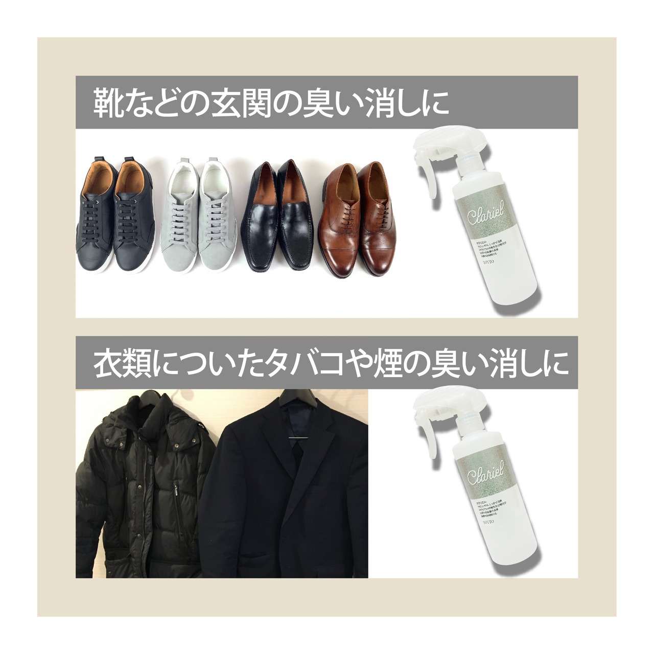 Clarielは、先進の光触媒分解消臭技術を採用し、臭いの元となる成分をしっかりと分解する効果があります。従来の消臭スプレーのように香りでごまかすのではなく、臭いの根本から解決してくれる商品です。