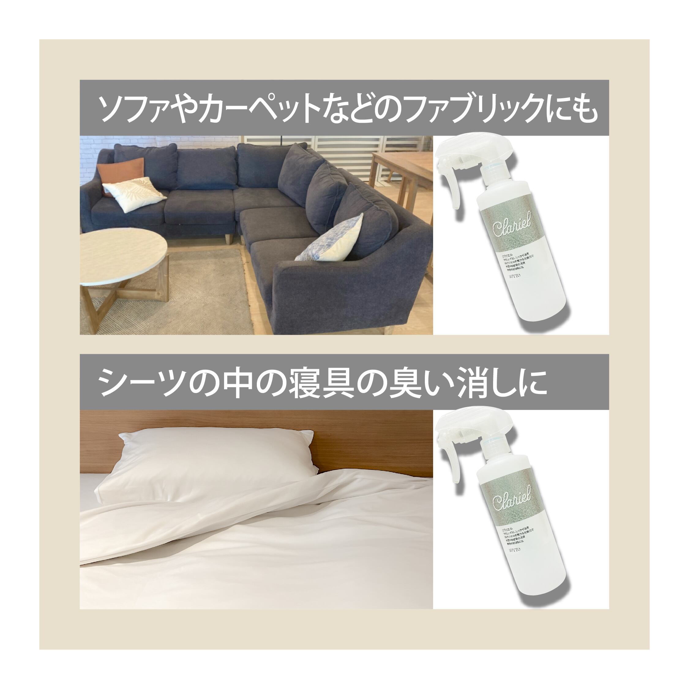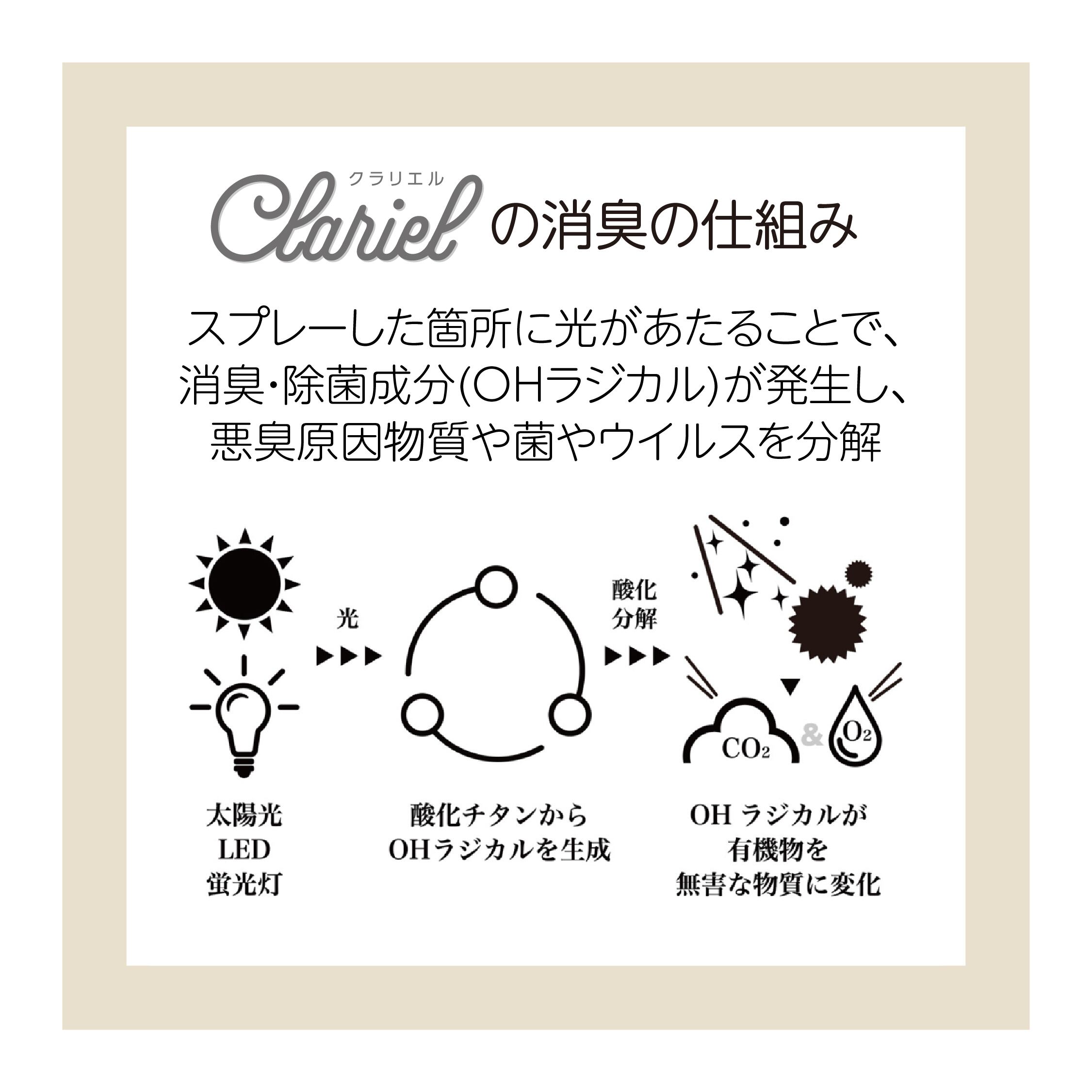 Clarielは、先進の光触媒分解消臭技術を採用し、臭いの元となる成分をしっかりと分解する効果があります。従来の消臭スプレーのように香りでごまかすのではなく、臭いの根本から解決してくれる商品です。