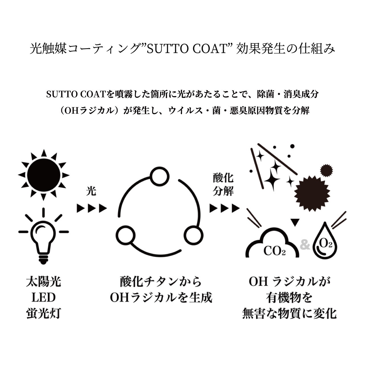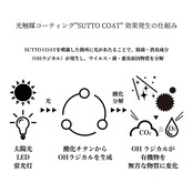 光触媒技術を利用して作られた"SUTTO COAT"でコーティング。太陽光や室内灯に当たることで除菌・消臭成分(OHラジカル)を発生させます。