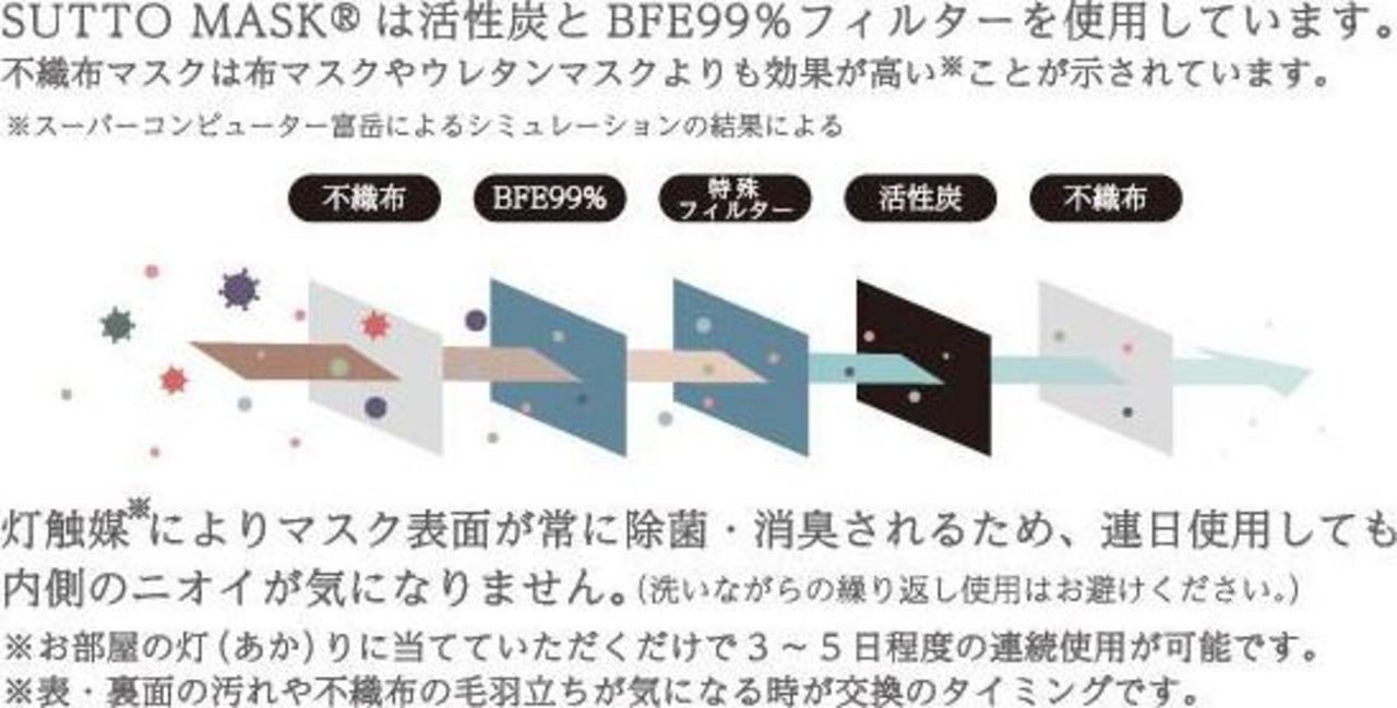 活性炭を含む計5枚の不織布で製造。菌・ウイルス・有害物質を吸着し、口や鼻に入り込むリスクを最小化(BFE99%フィルターを使用)。
