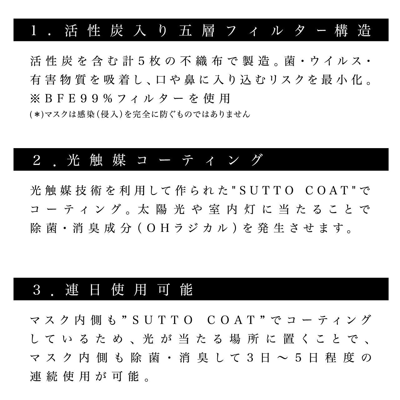 マスク内側も"SUTTO COAT"でコーティングしているため、光が当たる場所に置くことで、マスク内側も除菌・消臭して3日〜5日程度の連続使用が可能です。