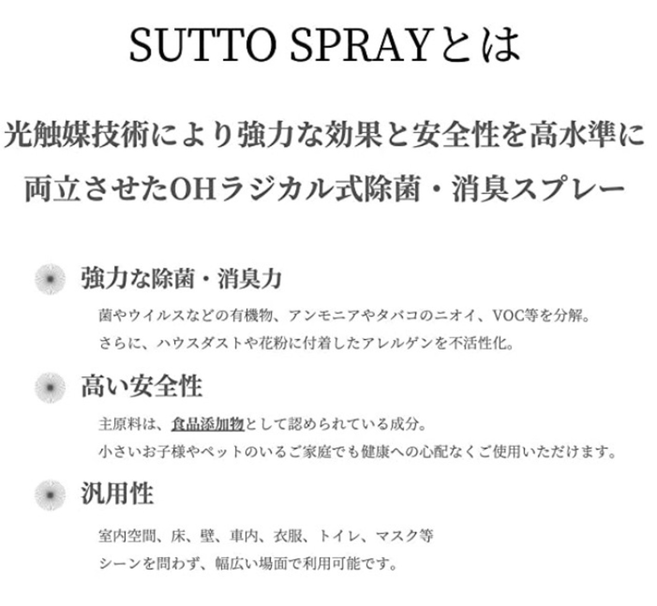 SUTTOスプレーは、OHラジカル*式の除菌。消臭スプレーです。